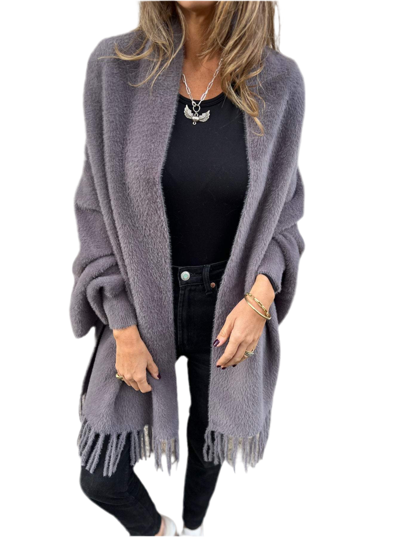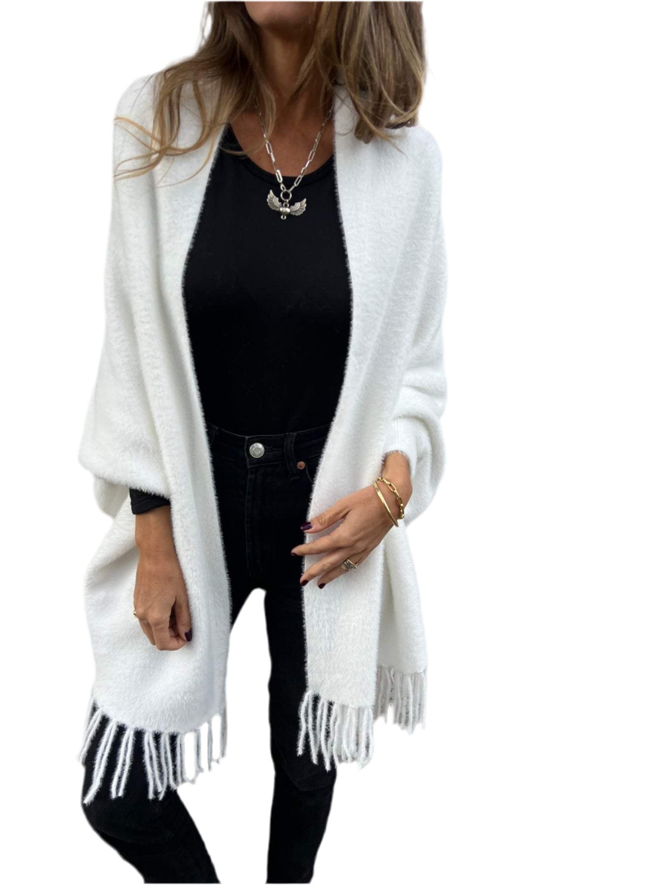 Esta prenda es una opción ideal para salidas con tus amigas o reuniones de trabajo. Gracias a su tejido hecho de lana y algodón y a su corte ancho, aporta libertad de movimientos, comodidad y un cuidado sencillo, por lo que seguirá como nuevo después de cada lavado. Además, combina un elegante cuello chal con mangas largas para brindar estilo y calidez, lo que lo convierte en una prenda imprescindible para los meses más fríos, mientras que los flecos dan ese toque de elegancia.