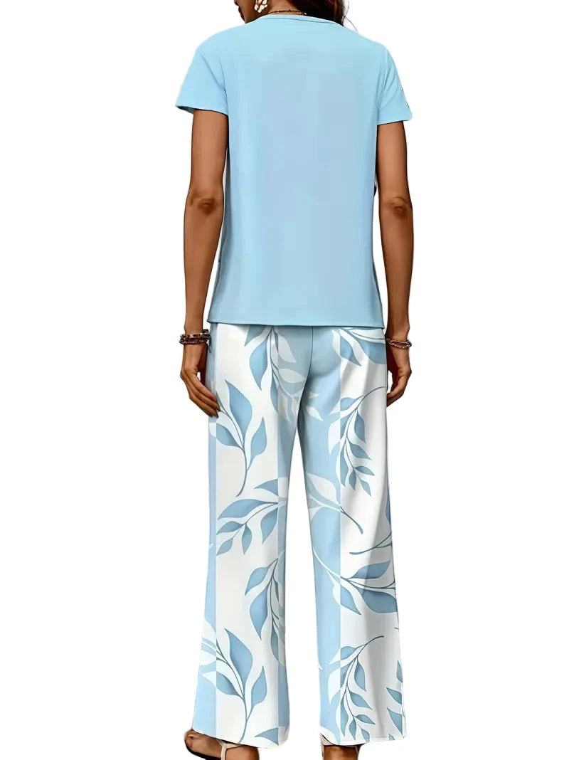 Dile adiós al estrés matutino de elegir tu atuendo. Este ligero conjunto para mujer combina una blusa azul claro sin mangas con un pantalón palazzo blanco con un sofisticado estampado de hojas, creando el atuendo perfecto para el verano en una sola prenda. La blusa evasé favorece cualquier figura, mientras que el pantalón ancho de cintura alta se mueve con elegancia a cada paso. Ya sea de vacaciones, en un brunch o en una fiesta veraniega en el jardín, este conjunto irradia tranquilidad, clase y un estilo natural.